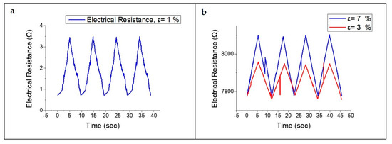 Response of LIG strain sensor under stretch/release cycle of (a) ε = 1%; (b) ε = 3% and 7%.