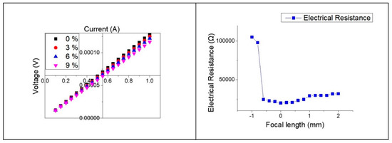 As shown in the experimental results, our strain sensors can be applied in many areas with advantages such as high sensitivity, fast response speed, high linearity, and low hysteresis. Figure 10a shows the current–voltage characteristics according to the different strain conditions of the LIG strain sensor and indicates that Ohm’s law is followed linearly when tensile strain is applied. When a certain amount of voltage is applied to the sensor, it is confirmed that the electrical resistance increases as the strain of the sensor increases and, therefore, the current value becomes smaller. LIG strain sensors have been fabricated using different focal lengths; for the resulting GFs, initial electrical and sheet resistances are shown in Figure 10b. The fabricated LIG strain sensor showed higher GF, and lower electrical resistance and sheet resistance as the laser focal length was matched to that of polyimide. This indicates that the degree of carbonization of the polyimide film has a great influence on the LIG sensor.