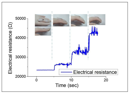 Due to the flexible and highly sensitive nature of the LIG strain sensor, application to human motion monitoring was considered. In terms of potential evaluation of our sensor’s application to wearable devices, we built a glove sensor that combined latex gloves and sensors. As shown in Figure 11, our sensor was fully responsive to finger movements. We strained the sensor by bending the middle finger joint to a specific angle. As the finger bends more and more, i.e., as the bending angle increases, the strain applied to the sensor increases, thereby increasing the electrical resistance. Also, when we straightened the middle finger again, the sensor returned to its initial electrical resistance value. Moreover, the LIG strain sensor showed very good durability because it returned to its initial state even after repeated finger-bending cycle experiments.