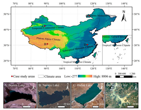 Four case study areas around China, characterized by different water types, climate features, and underlying landscapes, were chosen to examine the robustness and the applicability of the approach. Figure 1 shows their locations and remote sensing images, and Table 1 provides basic information about case study areas.
