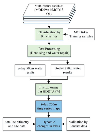 This study aimed to map continuous lake water extents with high spatiotemporal resolution. It is conducive to more accurately understand the “water” variations of the lakes. Four different types of lakes have been selected and used as application cases. The approach comprises of three basic parts: (1) Preliminary water classification using the RF classifier; (2) post-processing, including de-noise and water restoration; and (3) water result fusion using the HDSTAFM method. Continuous water results at high frequency (every eight days) and moderate spatial resolution (250 m) have been provided for these four lakes.