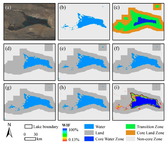 The example of automated extraction of water extent and water fusion result in Bosten Lake. (a) False-color composite (bands 1, 4, and 3) on 2,016,081th day; (b) the MOD44W water result; (c) the buffer, including CWZ, TZ, and CLZ; (d,e) water results of 2,016,081th and 2,016,089th days from MOD09A1, respectively; (f) the water result of 2,016,081th day from MOD13Q1; (g,h) fused water results of 2.016,081th and 2,016,089th days, respectively; and (i) the water inundation frequency (WIF) map.