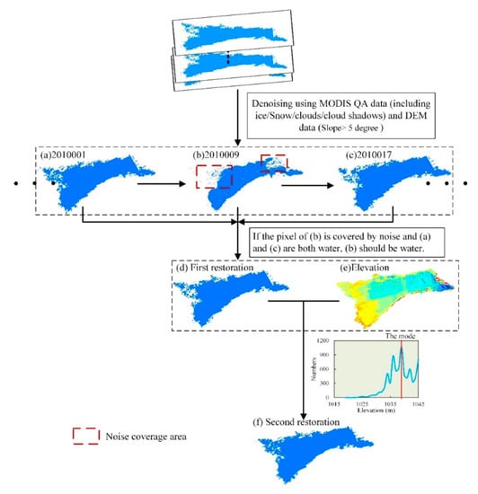 Post-processing includes de-noise and water restoration (Figure 4). MODIS QA data is used to remove the noise for the preliminary water results, including ice, snow, clouds, and cloud shadows. In addition, some lakes in the mountain or plateau need to remove terrain shadows by slope data. In this study, we considered that no surface water is present in places where the slope is >5°.