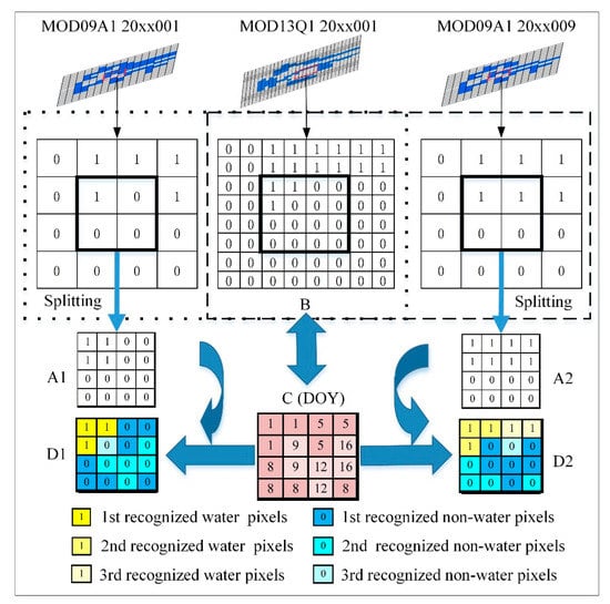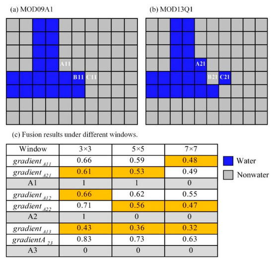 Pixels A12 and A22, are also at the junction of water and land, but A12 = 1 and A22 = 0. The resulting value of the fused pixel A2 is equal to 1 (D2 = A12) for the 3 × 3 window, and it is equal to 0 (A22 = 0) for the 5 × 5 or 7 × 7 windows. This example illustrates that when the window is small, the “water-and-land” boundary pixel tends to the “water” result of MOD09A1; otherwise, it tends to the “non-water” outcome of MOD09A1 when exceeding a certain range. Combining the two examples, the fusion results of A1 and A2 are both biased towards the “water” for a smaller window and towards the “non-water” for a larger window. Moreover, it indicates that 5 × 5 is the best alternative window size compared to 3 × 3 and 7 × 7. A13 and A23 pixels, are relatively far from a wide range of water bodies but A23 is recognized as “water” because of its higher resolution or we have a potential misidentification when the fusion results are biased towards “non-water”.