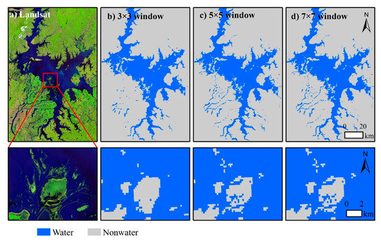 Figure 7b–d shows that the fusion results of the 3 × 3, 5 × 5, and 7 × 7 windows in Poyang Lake have all been feasible for the methodology. However, some details also exist for small water bodies, especially for complex ones, which are characterized by algae, clouds, and their spatial resolution. The “non-water” part of the 3 × 3 window result is relatively large, and some “water” pixels and plaques have not been extracted. The result of the 7 × 7 window is relatively small, and some “non-water” pixels have been treated as “water”.