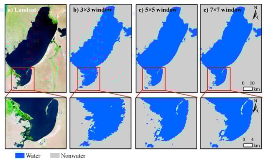 Similarly, Figure 8b–d shows the fusion results of 3 × 3, 5 × 5, and 7 × 7 windows in Hulun Lake, respectively. There are both obvious misclassification in “water” and “non-water” plaques in the result of the 3 × 3 window (Figure 8b). Most of the “water” pixels have been extracted but there are also some subtle “water” pixels or plaques that have been misclassified in the result of the 7 × 7 window (Figure 8c). Compared to the result of the 7 × 7 window, the advantage of the 5 × 5 window is mainly reflected in the better extraction effect on some fine “water” bodies.