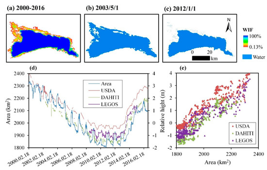 The water extent of Hulun Lake has presented large variations in the period 2000–2016, which can be divided into two phases: It has decreased in the period 2000–2010 and increased in the time interval 2011–2016 (Figure 11d). The maximum “water” area occurred in 2003/4/7 (Figure 11b), and the minimum in 2010/11/9 (Figure 11c). The “water” variations mainly occurred in the northeast and southeast of the lake. Figure 11e presents the relationship between the “water” area and the “relative height” in Hulun Lake. They are equal to 0.93, 0.93, and 0.92 for the USDA, DAHITI, and LEGOS, respectively, which indicates the fact that the obtained results are quite reliable (Table 2).