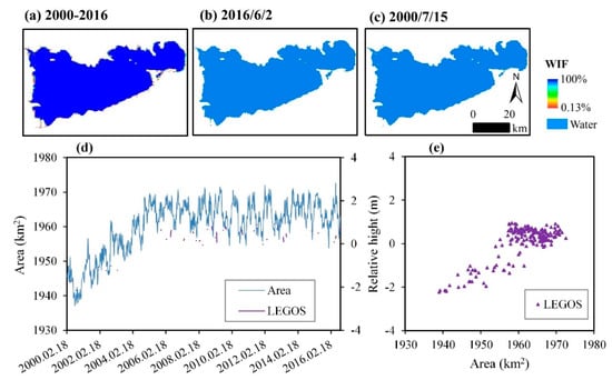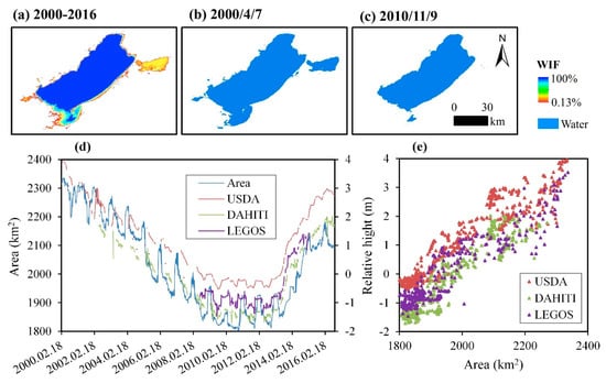 Spatial distribution and temporal variation of Hulun Lake. (a) The WIF map in 2000–2016; (b) water body map of 2000/4/7, with the largest water area in 2000–2016; (c) water body map of 2010/11/9, with the smallest water area in 2000–2016; (d) time series of the water area (km2) and relative height (m) in 2000–2016; and (e) correlation between water area (km2) and relative height (m).