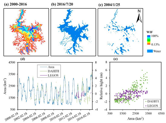Spatial distribution and temporal variation of Poyang Lake. (a) The WIF map in 2000–2016; (b) water body map of 2016/7/20, with the largest water area in 2000–2016; (c) water body map of 2004/1/25, with the smallest water area in 2000–2016; (d) time series of the water area (km2) and relative height (m) in 2000–2016; and (e) correlation between water area (km2) and relative height (m).