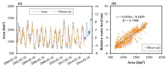 The relationship between the water area and water level. (a) Time series of the water area and observed relative water level in 2000–2016. (b) The correlation between them.