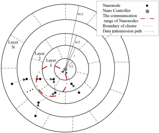 In the EBCR protocol, the network topology of iWNSNs can be represented as G = (V,E), where V = {v1, v2, …, vn} represents a set of all nano-nodes and nano control nodes, and n = |V| is the number of nodes. The proposed routing framework (shown in Figure 1) is a multi-layer topology based on the distance between nano-nodes and nano control nodes. In order to improve the stability of the network and achieve high energy efficiency, each layer is divided into multiple clusters to avoid repeated clustering. The cluster head node (Cluster Header, CH) of each layer is selected based on the residual energy of the nano-nodes. The cluster head collects data from the cluster member node (CM) and then forwards the summary data to the NC. The clusters of each layer can communicate with adjacent upper or lower clusters.