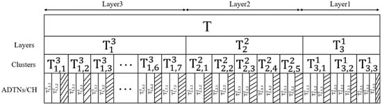 Figure 5 illustrates a time scheduling process for a three-layer network that requires T time to complete the transmission cycle. The time slots are arranged in the order from the outer layer to the inner layer. NC divides the time slot , and to Layer 3, Layer 2 and Layer 1 respectively. Layer 1 has three clusters, Layer 2 has five clusters and Layer 3 has seven clusters. Each cluster of Layer 1 has four active nodes ADTN for data transmission, and Layer 2 and Layer 3 for each cluster head have two active nodes. Since the cluster heads between layers need to transmit data, it is necessary to optimize the slot scheduling. For example, the third layer () divides one time slot for each of the seven clusters, and the corresponding time slot numbers are respectively. Considering that the inter-layer cluster head needs communication, three sub-time slots are divided. The first two time slots are used for data transmission of the active node ADTN, but , the shaded part in the Figure 5 is used for data transmission between the cluster heads. This process is repeated for all clusters and layers. This slot scheduling scheme makes optimal use of the large bandwidth provided by the THz band and avoids transmission collisions at the CH and NC.