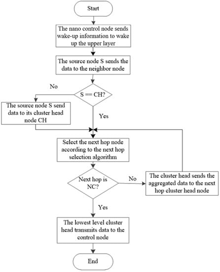 The DTP between clusters and between layers is shown in Algorithm 4. The CH fuses the data and selects the appropriate adjacent lower layer CH according to the link cost function and forwards the data. After forwarding the data, the CH uses the cluster head update algorithm to initiate a new CH election. The new CH then multicasts its new state to other CMs. The previous CH provides its information list to the new CH and enters the data collection mode. All nodes except the new CH start collecting data and suspending the data transfer mode until another wake-up message arrives. The EBCR algorithm process is shown in Figure 6.