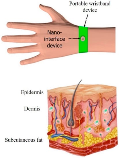 The nanointerface device is placed on the back of the hand, and the nano-nodes are implanted into the skin to monitor certain skin indicators. The biological composition of the back of the hand can be modeled as a layered structure, the upper layer consisting of skin, divided into dermis and epidermis. It is demonstrated in [25] that these two human tissues have very similar electrical properties, so in this paper, both are treated as a single tissue. The middle layer represents subcutaneous fat, which is thinner on the back of the hand. This thinness makes the back of the hand ideal for building a body area network because the distance between the outside and the vein is quite short. As described in [26], nanodevices must be encapsulated in biocompatible capsules or artificial cells for implantation into the human body.