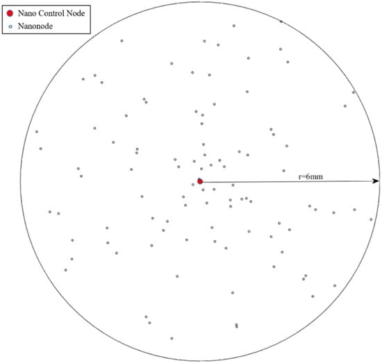 The simulation scenario in this paper considers the nano-nodes deployed in the skin dermis of the hand to construct a nanonetwork. According to [27], the molecular absorption factor of the skin is 110, the refractive index is 1.73, and the system parameter in Equation (16) is set to 0.5, the residual energy threshold in Equation (18) is set to 1.4 × 10−13J [21], which represents the energy consumption required to receive unit bit data when the transmission distance is 0.002 m. The simulation scenario is shown as Figure 8. Nano-nodes are randomly distributed in the area. The remaining specific simulation parameters are set as Table 1 is shown.