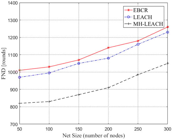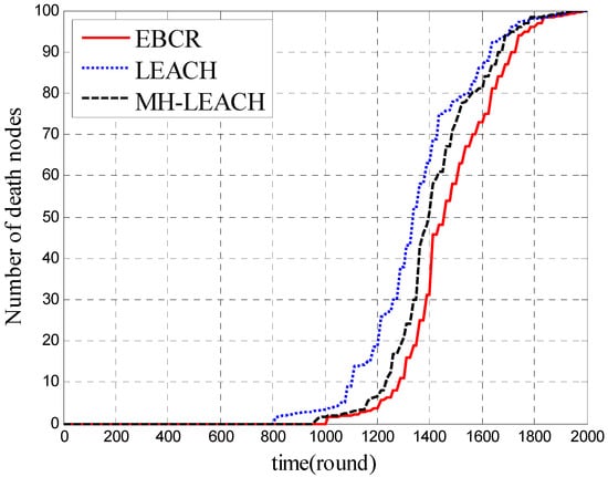 In Figure 9, the network lifetime is analyzed by simulating the number of dead nodes in the network. The simulation time is represented by rounds (each round is 120 s). In Figure 10, the time when the first node is dead is compared. In the simulation, the time refers to the number of iteration round. FND is the abbreviation for First Node’s Death. We choose LEACH and MH-LEACH to compare rather than SFR in this part because SFR has an energy void and there is no need to compare its network lifetime to EBCR. According to Figure 9 and Figure 10, we can see that the EBCR protocol prolongs the death time of the first node in the network and improves the stable transmission time of the data in the network. This is because EBCR preferentially selects the cluster with higher residual energy when selecting the cluster head node while LEACH and MH-LEACH randomly select the cluster head, causing the cluster head node to die prematurely. In addition, both EBCR and MH-LEACH adopt multi-hop forwarding, which can well balance the energy consumption in the network and effectively prevent the node from exhausting energy due to massive data transmission. In general, the EBCR protocol can well balance network energy consumption and extend network lifetime.