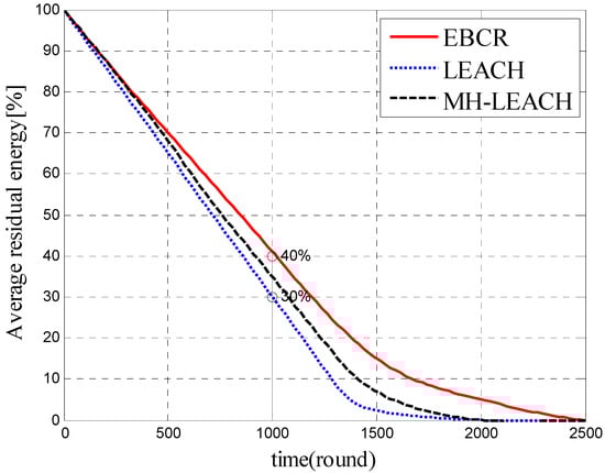 Figure 11 shows the average residual energy of nodes in the network. As same to the comparation of the network lifetime, we choose LEACH and MH-LEACH to compare rather than SFR in this part because SFR has an energy void and there is no need to compare its average residual energy to EBCR. The percentage of residual energy at each time for the three algorithms can be compared from Figure 11. At the same time, the average residual energy of the EBCR is always higher than that of LEACH and MH-LEACH. This shows that the EBCR protocol is more efficient in saving network energy and improving node energy utilization.