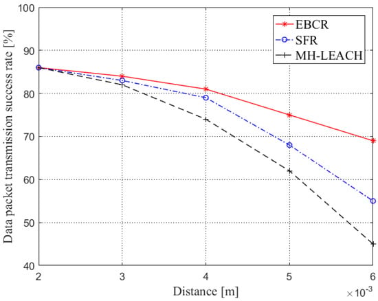 Figure 12 shows the comparison of the success rate of data packet transmission in the aspect of the distance. With the increase of the distance between nodes, the transmission success rate of three protocols is decreasing. This is because there is the possibility of packet loss during the frequent forwarding of data. However, the transmission success rate of EBCR and SFR is always kept at a higher level. When the communication distance is greater than 4 mm, the data packet transmission success rate of MH-LEACH decreases, this is because when the communication range increases, the cluster head close to the control node needs to frequently participate in data forwarding. Furthermore, the cluster head update of MH-LEACH is random. When some nodes with less energy are selected as cluster heads and participate in data forwarding, data packets are lost due to exhausted energy, which also reflects the advantages of EBCR’s cluster head update mechanism.