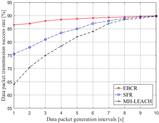 Figure 13 shows the comparison of the success rate of data packet transmission in the aspect of data packet generation interval. As can be seen from the figure, the packet transmission success rate of the EBCR protocol is always higher than that of the other two protocols. This is because the protocol ensures the path from the source node to the destination node through hierarchical clustering and cluster head update. The correct forwarding of data packets improves the reliability of the network. In SFR, due to the flooding mechanism, a reliable path can always be found between the source node and the destination node to ensure the success rate of data packet transmission. However, because of this, the frequent participation of nodes in data forwarding also causes the energy consumption of nodes in the network. When many nodes die, it will affect the success rate of data packet transmission. For the MH-LEACH protocol, as the network load increases, the cluster head nodes close to the control node die due to frequent participation in forwarding, resulting in a sharp drop in the success of data packet transmission.