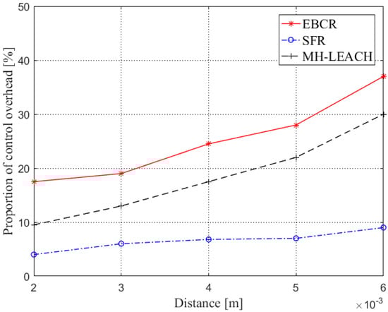 It can be seen from Figure 14 that the proportion of control overhead of the EBCR and MH-LEACH is always higher than that of SFR. Obviously, the control overhead of SFR is lower than that of clustering protocols. In the multi-hop forwarding process of the MH-LEACH protocol, a route needs to be established, which causes a certain control overhead. When the distance between the source node and the control node is small, the routing process of the MH-LEACH protocol is relatively simple, and the control overhead is small. As the distance increases, the process of establishing the route by the MH-LEACH protocol becomes complicated, and the control overhead also increases. Furthermore, because the EBCR protocol stratifies the network before clustering, the control overhead is slightly larger than MH-LEACH. However, it is also through this hierarchical clustering method that the communication load and energy consumption of the nano nodes are minimized while ensuring the successful transmission of data packets.