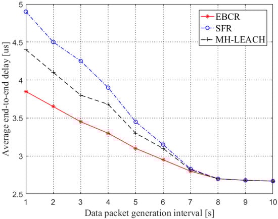Figure 15 compares the end-to-end delays of the three protocols. In general, the average end-to-end delay is reduced as the packet generation interval increases. This is because when the packet generation interval becomes larger, the number of packets arriving in the node buffer per unit time becomes smaller, and the time at which the packet waits for transmission in the buffer area is shortened, thereby reducing the end-to-end delay. Moreover, when the packet generation interval is large (≥7 s), the average end-to-end delay of the three protocols is relatively close. In addition, the end-to-end delay of the route established by the EBCR protocol is smaller than the other two routes.