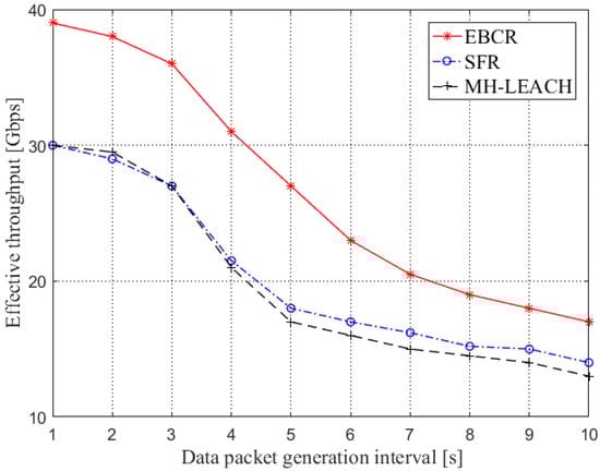 Figure 16 compares the effective throughput of the three protocols. As the interval of data packet generation increases, the effective throughput of the three protocols also decreases. This is because as the interval of data packet generation increases, the number of data bits flowing into the network per unit time decreases. The size of the effective throughput is related to the transmission success rate and the transmission rate of the selected link. According to the previous analysis, the EBCR protocol has a good data packet transmission success rate and a low delay. It can be seen that the EBCR protocol enables the iWNSNs to exhibit a very good network performance.