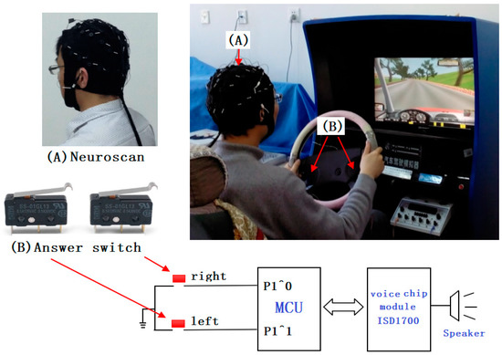 In the experiment, the MRM was used to relieve driver fatigue caused by long-term driving. The hardware of the MRM mainly includes an answer switch, a Micro Control Unit (MCU), a speaker, and a voice chip module (ISD1700) produced by the Information Storage Devices. For the MCU, the model we chosen was the STM32F103RCT6. There are three ways in which fatigue can be relieved by adopting this mode. Firstly, the MCU randomly gives two two-digit numbers through the speaker, which take values from 0 to 100. After hearing these two numbers, the subjects need to calculate the sum of the two numbers and judge whether the sum is three digits. If this sum exceeds three digits, the subjects press the “right” answer switch, otherwise press the “left” answer switch. Secondly, the subjects need to judge whether this sum is divisible by 3. Similarly, subjects need to press the “right” answer switch on the steering wheel if the sum can be divided by 3, otherwise press the “left” answer switch on the steering wheel. The subjects need to complete both responses within 5 s, otherwise, it is regarded as a mistake. Thirdly, the MCU plays cheerful music (Bandari Light Music) for 3 s through the speaker if the response is correct, otherwise, the speaker plays an error warning sound (Siren Vintage Sounds). In the experiment, the MCU continuously raises questions. This fatigue-relieving operation mode (MRM) was repeatedly executed until the end of the driving experiment in the MRM. In the experiment, the data acquisition needed to stop responding to eliminate interference.