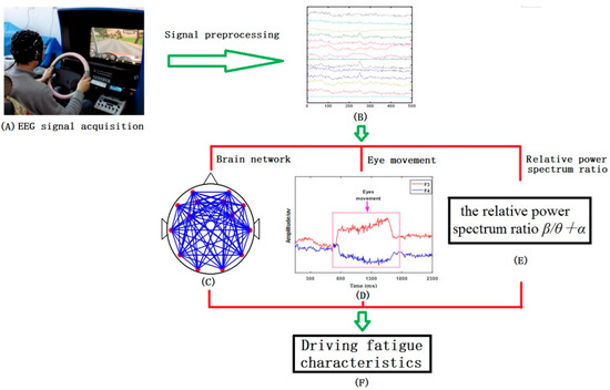 (A) EEG signal acquisition; (B) 14 channels of original signals collected; (C) Building brain network; (D) Analysis of eye movement signal characteristics; (E) Calculate the relative power spectrum ratio β/θ+α; (F) Analysis of Driving Fatigue Characteristics.
