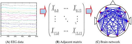 In this paper, the correlation coefficients between pairs of signals from 14 channels were calculated using Equation (4). Then, brain networks were constructed according to the following steps.