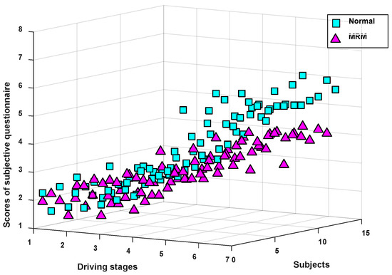 As can be seen from Figure 4, the average SQ score of subjects driving in the two test modes presented an increasing trend, which means that the subjective driving fatigue degree of subjects continued to deepen over time. In addition, there was no significant difference in the average SQ score between the two driving modes from driving stage 1 to stage 4. However, the subjective fatigue degree of the subjects in the last three driving stages (stages 5–7) was obviously lower in the MRM than in the normal driving mode, which means that the MRM can alleviate driving fatigue compared with normal driving.