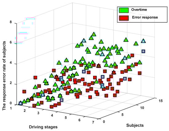 In our experiment, with the prolongation of driving time, the subjects experienced different degrees of driving fatigue and their alertness also decreased. When the response time of a subject exceeded 5 s, the system thought that the response was overtime, and when the subjects answered incorrectly, the system recorded the answer as wrong. Both cases were recorded by MCU within 27 min of each experimental stage. The results are shown in Figure 5 below.