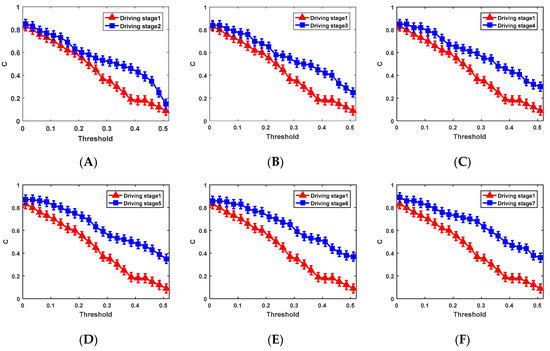 (A) Comparison of the C between driving stage 1 and driving stage 2 when the threshold value take different values; (B) comparison of the C between driving stage 1 and driving stage 3 when the threshold value take different values; (C) comparison of the C between driving stage 1 and driving stage 4 when the threshold value take different values; (D) comparison of the C between driving stage 1 and driving stage 5 when the threshold value take different values; (E) comparison of the C between driving stage 1 and driving stage 6 when the threshold value take different values; (F) comparison of the C between driving stage 1 and driving stage 7 when the threshold value take different values.