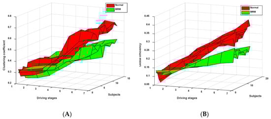 Previous studies have shown that the characteristics of the brain network change with the changes of human alertness [53,54,55]. Kar and Sun indicated that there is a growth trend of the two parameters (C and G) as subjects’ fatigue deepens [33,56]. Stam et al.’s study showed that human mental fatigue continues to deepen during the continuous operation processes, and the corresponding brain network parameters C and G show overall upward trends [57]. This result is consistent with our research. In this study, as shown in Figure 8, the two brain network parameters (C and G) of the subjects driving in normal mode also showed overall upward trends. However, the subjects driving with MRM showed slower upward trends because the brain nerves were continuously stimulated at successive driving stages, which keep the nerves in a relatively excited state.