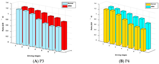 Figure 9 shows that the ratio (β/θ + α) of the relative power spectrum presented a downward tendency over time, which indicates that the level of brain activity decreased over time. The driving fatigue degree of subjects gradually decreased over time. Additionally, the ratio β/θ + α, which relates to the MRM, showed a smaller downward trend compared with driving in the normal driving mode. The difference between the two driving modes is significant (P3: |t| = 2.527 > t0.05,12 = 2.179, p = 0.03 < 0.05; P4: |t| = 2.633 > t0.05,12 = 2.179, p = 0.02 < 0.05). This means that the driving fatigue of subjects in the MRM decreased more slowly compared with that of the normal mode.