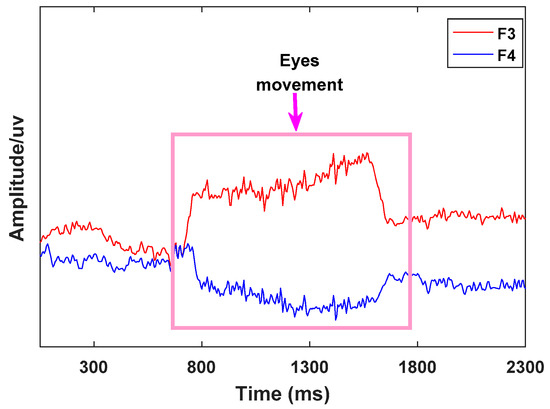 Studies have shown that humans make coordinated movement of the eyes to orient the high-acuity part of the retina on relevant objects in the world and facilitate their processing [12,13,44]. Human eye movement signals are easily detected in the prefrontal region of the brain. In this paper, channels F3 and F4, in which the signal waveforms have a negative correlation when eye movements occur, were chosen to identify eye movement features. Taking eye movement to the right as an example, the waveforms of the two leads F3 and F4 are shown in Figure 10.