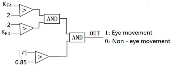 The absolute value of K, which reflects the signal fluctuation characteristics of F3 and F4, is greater than 2 when eye movement occurs. At the same time, the signal waveforms of F3 and F4 show a negative correlation when eye movement occurs, and the absolute value of the correlation coefficient is greater than 0.85. In our work, K and the correlation coefficient r were used to identify eye movements. The discrimination logic is shown in Figure 11.