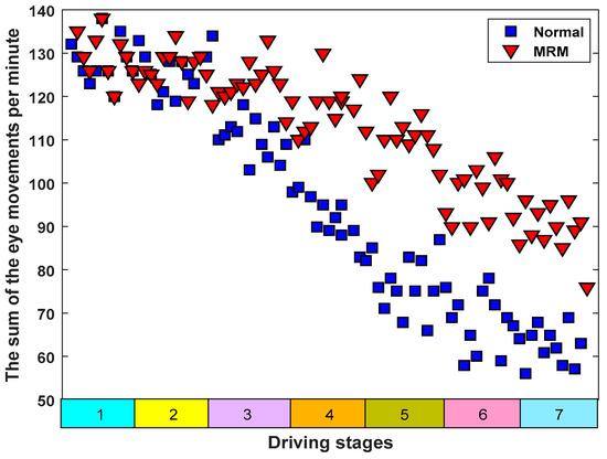 Studies have shown that eye movement frequency is related to mental fatigue [59,60]. Marzano et al. studied human eye movements and concluded that when humans gradually enter a state of mental fatigue, their eye movements become significantly slower [61]. The research organized by Shin et al. showed that when subjects’ driving fatigue gradually deepened, their eye movement frequency decreased obviously [62]. Cazzoli et al. and Russo et al. concluded that people’s ability to obtain external information from the eyes was weakened when their mental fatigue continued to deepen, which was characterized by a decrease in eye movement frequency [63,64]. These research conclusions are consistent with our experimental results. In this study, as shown in Figure 12, the eye movement frequency of subjects driving in normal mode also showed an overall downward trend. However, the eye movement frequency of subjects driving with MRM showed a relatively slow downward trend. The reason for the difference was that the MRM stimulated the brain nerves, causing subjects to maintain their normal thinking activities, which meant that the brain nerves maintained their ability to obtain outside information.
