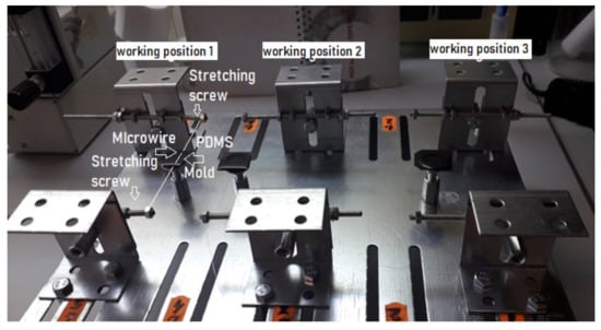 For fabrication of PDMS based sensor it is necessary to generate straight microchannel inside PDMS block. The main steps include: (i) Preparation of mold support and microwires, (ii) Microwire fixing and alignment, (iii) PDMS Casting, Degassing and Curing, (iv) Demolding and Microwire removal, (v) Needles insertion and sealing by needles connection to the polyethylene tubes. Preparation of molds and devices before casting: The cylindrical polymer molds were punched diametral opus, with needles (300 μm in diameter). For fixing and aligning the wires there were custom made a custom stretching device with many working positions with screw (Figure 1) respectively with magnets for attachment of the wires were made. Every position is composed of two diametric disposed elements. The stretching was performed using a microscopic system by which a linear landmark was aligned with the stretched wire. There are two stretching devices: the first one was equipped with screws and locking nuts and the second one used permanent magnets for wires fixation. At the M4 × 1 screw, we used the nut & lock-nut system to lock the convenient position to ensure the linearity of the wire. The linearity was tested with a standard edge by parallelization with the stretched wire and microscopic observations. The permanent magnets have been chosen so that by application they will secure the firm lock of the pre-tensioned wire manually. The linearity was proved as in the case with a screw.