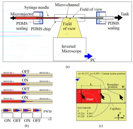 Figure 3. Experimental set up and measurements: (a) Schematic representation of the experimental set up, (b) MPWM principle, (c) The measurement performed by taking into account the advancement of the liquid boundary with the length (L) (the cross-sectional area of the channel is constant).