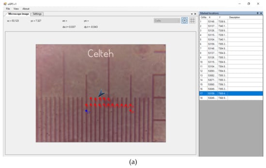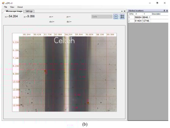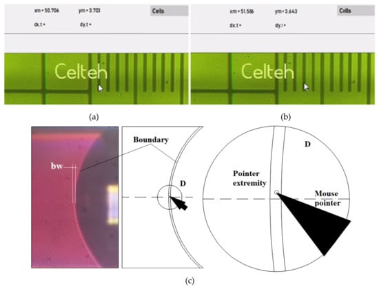 In Figure 4a,b, the mouse pointer coordinates are shown as pointed on the interface with xm and ym. These xm and ym values change interactively with the change of the position of the mouse, which allows the tracking of elements of interest on the screen of the video-microscope.