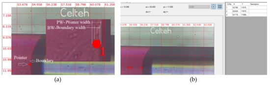 The measurements required for the experiment represent specific distances within the field of vision, i.e., the distance between two liquid fronts generated by the MPWM signal. Figure 9 shows, for example, the calibration mode of the DTCS system. After the calibration it was found that: 11 vital points (units) represent 10 µm (Figure 9a) and thus, with this calibrated system we were able to determine the diameter of the microchannel (Figure 9b). The DTCS system can associate a number of arbitrary units to a real calibration distance (µm) so that distances of less than 1 µm can be measured with very precise approximations.