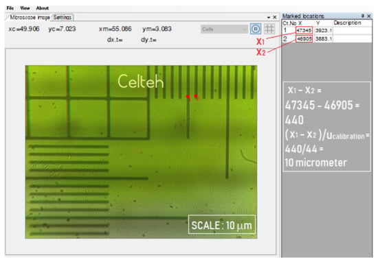 In Figure 9a calibration of 11 virtual units at a real distance of 10 μm is rendered by a specially graded ruler for this purpose. The meaning of the two red dots (1 and 2) from Figure 9b represents the positions of reaching the extremities of the visualized channel for measurement. The clarity of the image allows a precise reproduction of these edges, which leads to a precise diameter calculation. In order to determine the diameter of the microfluidic channel, a calibration of the DTCS with 44 virtual numerical units for a real distance of 10 µm was used. As can be seen in the image of the DTCS interface in Figure 9, the two reference points recorded by the human operator with the mouse on the screen, have the absolute x coordinates of x1 = 56.684 and x2 = 51.404. The difference between the two coordinates is the diameter of the channel expressed in virtual numerical units, i.e., 5280.