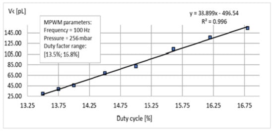 Tables S2 and S3 (Supplementary Materials) present experimental data for the calibration in the following conditions: a constant pressure of 256 mbar, frequency of 100 Hz and duty cycle range [13.5%, 16.8%]. These tables include the x-coordinates measured with the DTCS system and the calculated using Equation (2) and corresponding to the determined volumes. These data allow the MPWM user to determine the calibration function. This function allows us to calculate the appropriate duty cycle parameter for the transport of certain required volumes (imposed).