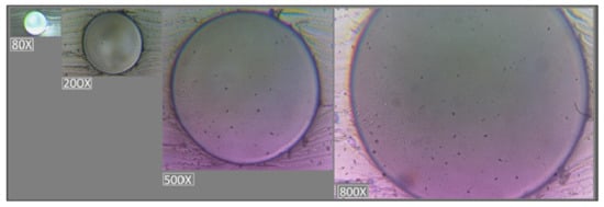 Figure 8. The circular cross-sectional area of microchannels produced by microwire molding technique, after 120 μm copper removal, at different magnifications (80 ×, 200 ×, 500 ×, 800 ×).