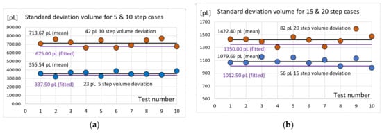 Figure 10. The values of the standard deviation for the four expected volumes: (a) for 5 and 10 steps cases; (b) for 15 and 20 steps cases.