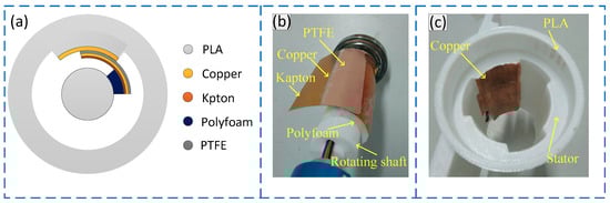 Figure 1 shows the schematic diagram of the structure of the sensor. Figure 1a shows the overall structure and composition of the sensor. The sensor consists of the rotating shaft and the stator. The rotating shaft is connected to the support section of the turbodrills and keeps rotating while the stator is connected to the turbine section of the turbodrills and keeps stationary. A layer of friction material is applied to both the rotating shaft and the stator. When the turbodrills is working, the friction material on the rotating shaft and the stator features a periodic process of “contact-separation,” achieving the measurement of the rotational speed based on the charge transfer law during the “contact-separation” process. Figure 1b,c presents the rotating shaft and the stator of the sensor respectively. The main structure of the sensor was 3D printed with the PLA material. The PLA material need a printing temperature of 210 °C, a blank thickness of 0.2 mm, and a structural duty ratio of 60%. A layer of copper material with a thickness of 0.05 mm was applied as a friction material on the inner wall of the stator, which also functions as an electrode for deriving the generated electric charge. The PTFE material (CTF30, Bench Co., LTD, Suzhou, China.) with a thickness of 0.03 mm was applied to the outer wall of the rotating shaft, and a layer of copper material, as another electrode, was attached on the back surface of the PTFE material (near the direction of the rotating shaft) for deriving the generated electric charge. Since the PTFE material and the copper material are relatively soft, problems such as entanglement may occur at a high rotational speed, which will affect the frictional electrification process. Therefore, the 0.1-mm-thick Kapton material with relatively good elasticity was adhered to the back surface of the copper material to support the PTFE material and copper material, ensuring the contact area between the rotating shaft and the stator. Moreover, based on the shrinkage of the foam, the Kapton material served as a buffer layer to convert the hard friction into soft friction, reducing the wear of the friction surface and improving the service life.