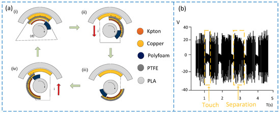 According to the above description of the sensor structure, when the sensor is working, the copper material and the PTFE material are in contact with each other regularly. Because of the triboelectrification, charge transfer will occur in the part where the two materials contact. According to the materials’ abilities to obtain and lose electric charge, the copper material is more likely to lose electrons than the PTFE material [14], because of the highest percentage of fluorine in PTFE, which leads to strong electron attraction. In addition, since the nucleus of copper is less attractive to external electrons, it is easy to lose electrons. So the surface of the copper electrode is positively charged while that of the PTFE material is negatively charged. Since the polymer material has good insulating property, the charge can remain on the surface of the material for a long time without disappearing [15]. Figure 2 shows the working principle of the sensor. When the sensor is working, the contact state between the rotating shaft and the stator inside the sensor can be divided into four processes, i.e., coincidence, relative slip, complete separation, and re-contact (as shown in Figure 2a). Specifically, as shown in Figure 2a(i), the two materials are in contact with each other to generate electric charge and charges with opposite polarities are in a state of mutual balance. At this time, no electric charge flows in the external circuit and the voltage approaches zero. The process of relative slip is shown in Figure 2a(ii), where there is a relative slip between the two materials because of the rotation of the rotating shaft, and the electric charges in the staggered position cannot cancel each other, thereby destroying the balanced state reached before. According to the electrostatic induction effect, in order to balance the potential in this area, the charge between the two electrodes will be transferred until the potential in this area is balanced again. Thus, when there is constant relative slip between the two friction materials, charge transfer continues between the two electrodes, with the voltage value gradually increasing. Figure 2a(iii) shows the state of complete separation. At this time, since the two friction materials are not in contact, there is no charge transfer between the electrodes, but the voltage between the two electrodes reaches the maximum saturation value. As the rotating shaft continues to rotate, it is the re-contact state as shown in Figure 2a(iv). When the PTFE friction layer and the copper material contact again, the charge will be transferred in the opposite direction and the voltage will gradually decrease until the two layers return to the state of complete bonding. Figure 2b shows the signal waveform of the sensor when it is working. When the two materials are in contact, the voltage decreases and approaches zero. When the two materials are not in contact, the voltage reaches a saturation value. It can be seen from the above description that the direction of charge transfers changes once in a cycle, that is, the alternating current signal output is generated, and the signal frequency is proportional to the rotational speed, so the frequency of the periodic signal can be counted through the hardware circuit, thereby realizing the measurement of the rotational speed.