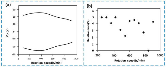 Statistical analysis results of the measured data under different rotational speeds. (a) Signal voltage amplitude of the sensor under different rotational speeds; (b) scatter diagram of relative error of the measured rotational speed.