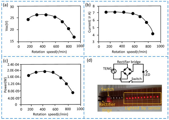 Experimental results of the self-powered sensor. (a) Curve showing the relationship between the output voltage and the rotational speed; (b) curve showing the relationship between the output current and the rotational speed; (c) curve showing the relationship between the output power and the rotational speed; (d) a picture shown the LED (light emitting diode) lighted by the sensor’s output power.