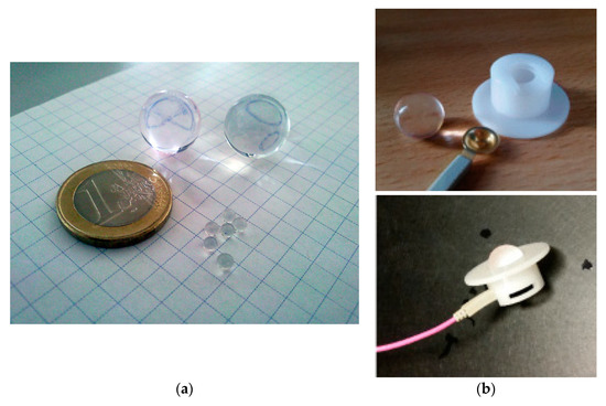 (a) Water beads before and after soaking for several hours in water. When fully swollen, the marble electrodes consist of up to 99.9% water and therefore become electrically conductive. (b) Top hat-shaped holder manufactured in a workshop of the University Eye Hospital, Tuebingen, and a marble electrode. The holders allow the marble electrode to be mounted at the scalp, while the connection between the marble and the amplifier is realized using a conventional gold-cup electrode. Top hat-shaped holders and gold-cup skin electrodes can be reused; the marble electrode is disposed of after use.